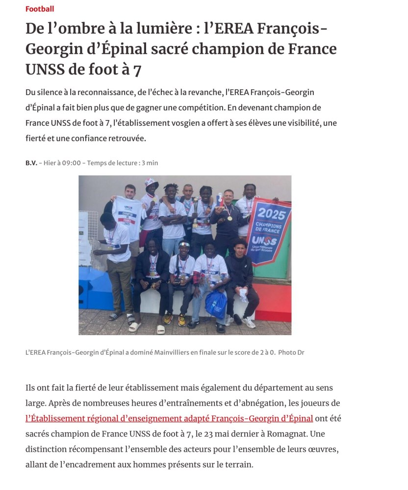 Notre équipe de Foot UNSS, « Championne de France des EREA », a eu les honneurs de la presse locale ce vendredi.